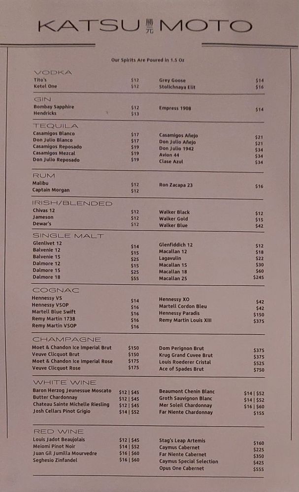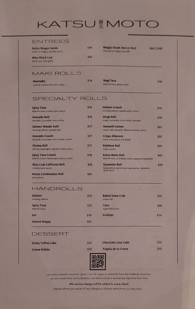 - Entrees: Savor the decadence of 4 Oz A5 Wagyu Steak for $80.00, or the melt-in-your-mouth Black Cod at $32.00.